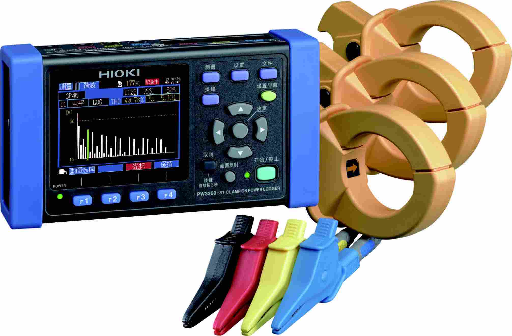 | 附件 | 电压线L9438-53×1(黑、红、黄、蓝),AC适配器Z1006×1,USB连接线(0.9m)×1,使用说明书×1,测量指南×1,彩色螺线管(红黄蓝各2个,用于区别钳形传感器的颜色)×1组,螺线管×5(用于捆扎钳形传感器线) |